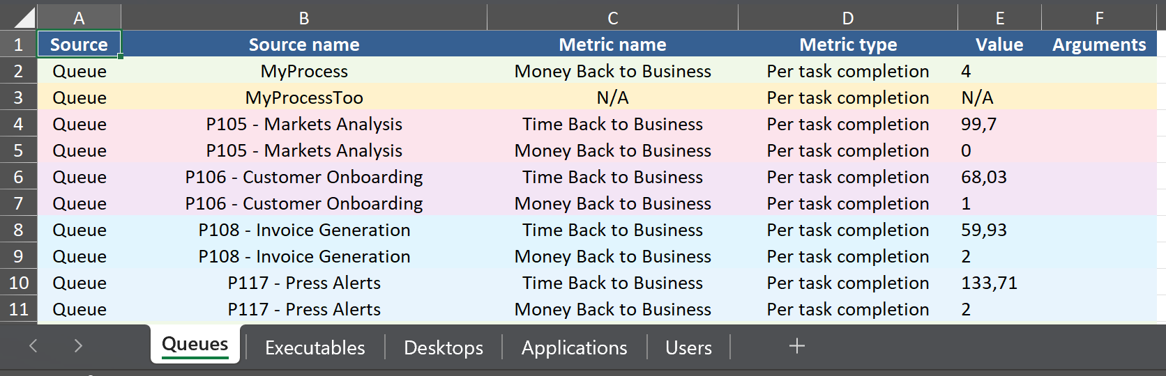 The report contains up to 5 sheets with all the available resources and which metrics that have been set to them.
