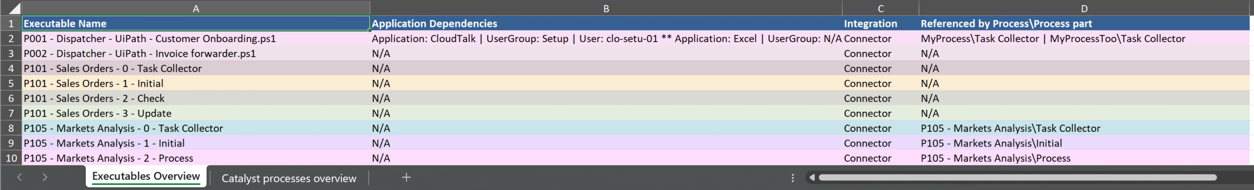 A breakdown of all executables from your RPA integration, showing which ones have been onboarded to Catalyst and which are still missing. It also highlights application dependencies, integration details, and references to the processes or process parts that rely on each executable.